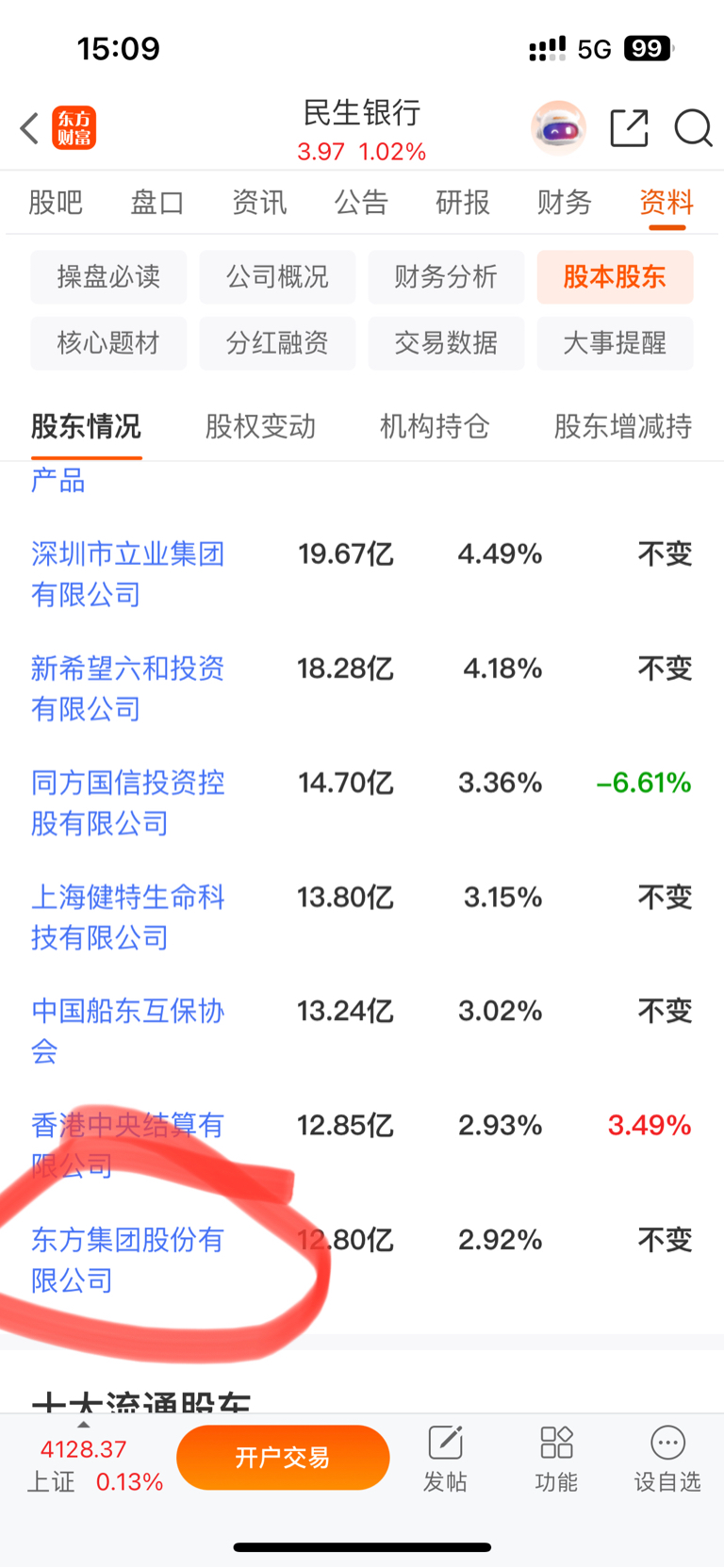 东方集团持有民生银行50亿元股票,目前市值不到10个亿,买100万能分到500万