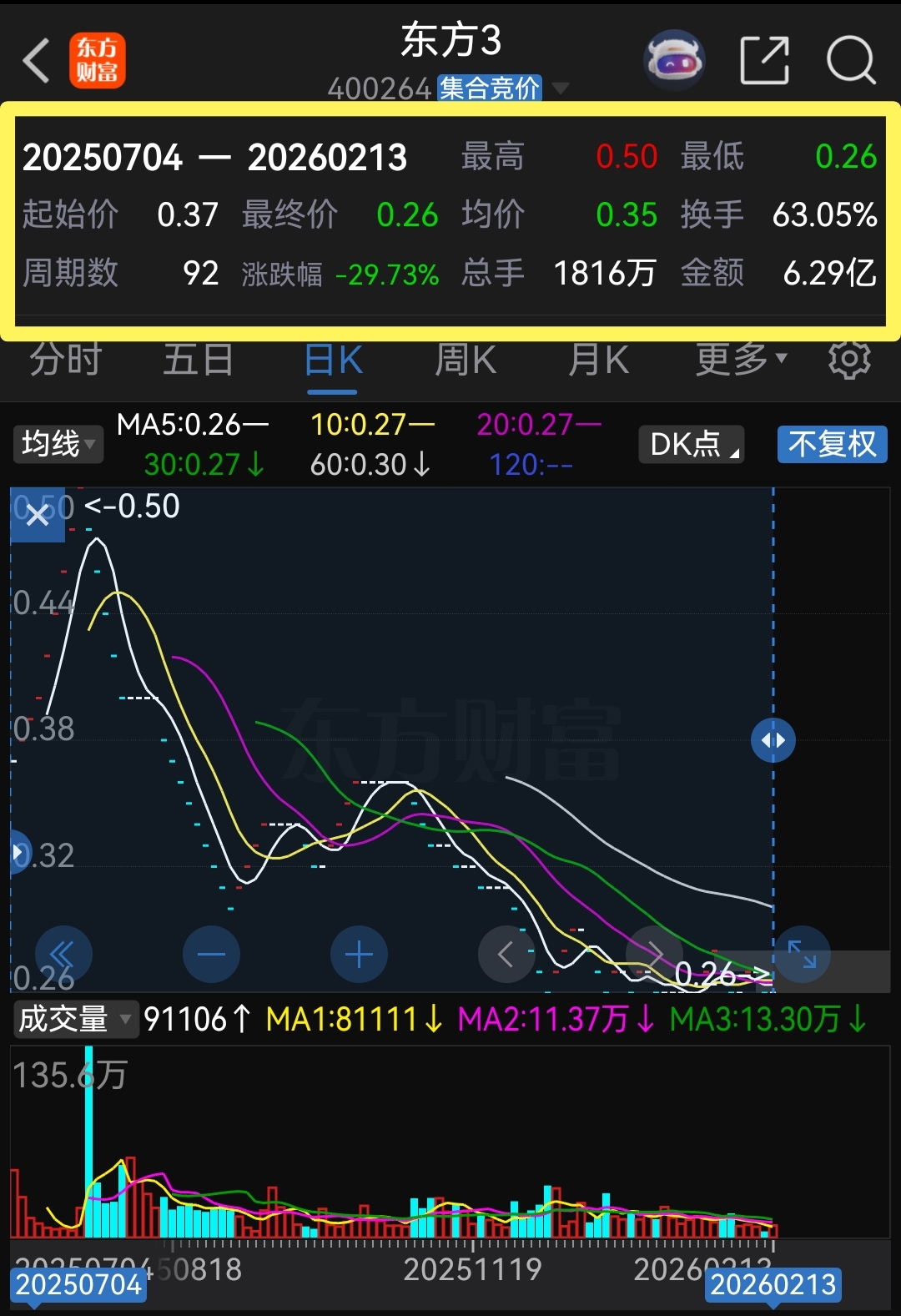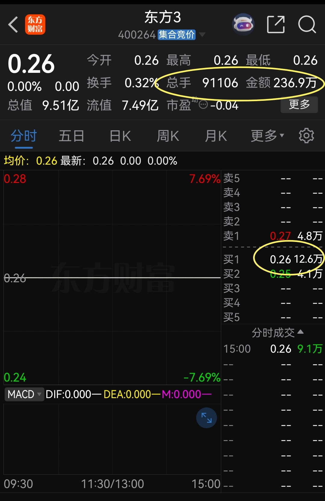 $东方3(SZ400264)$ 换手率还差一点!不急!再回看看退市前和转三板后的交易详细数据截,0.30元都属安全的!今天0.26元的买盘大大多于卖盘91106(成交)+126000(未成交)=217106(0.26元总买盘)