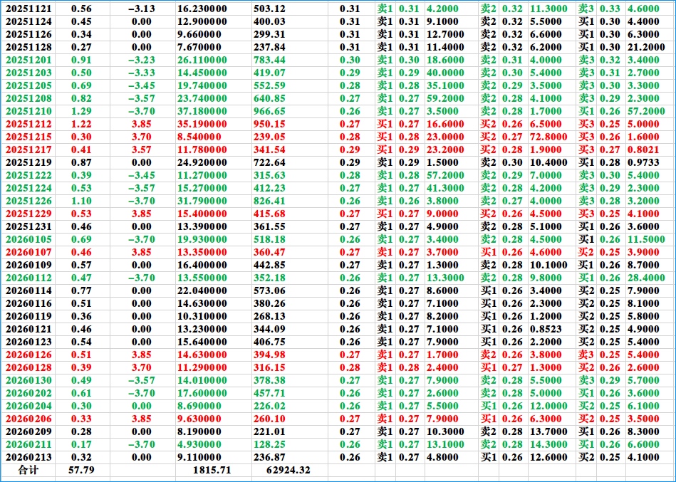 $东方3(SZ400264)$ 春节前的最后一个交易日。东方3的第92个交易日。20260213收盘后统计的东方3历史数据(含当天)。希望对朋友们分析有帮助。津信科5和东方3是我唯一持有的两支老三板股票,不买也不卖,长期持有。带着津信科5和东方3一直到2030!祝股友们新春大吉,马到成功,马年大吉,马上有钱!手中股票长红赚大钱!