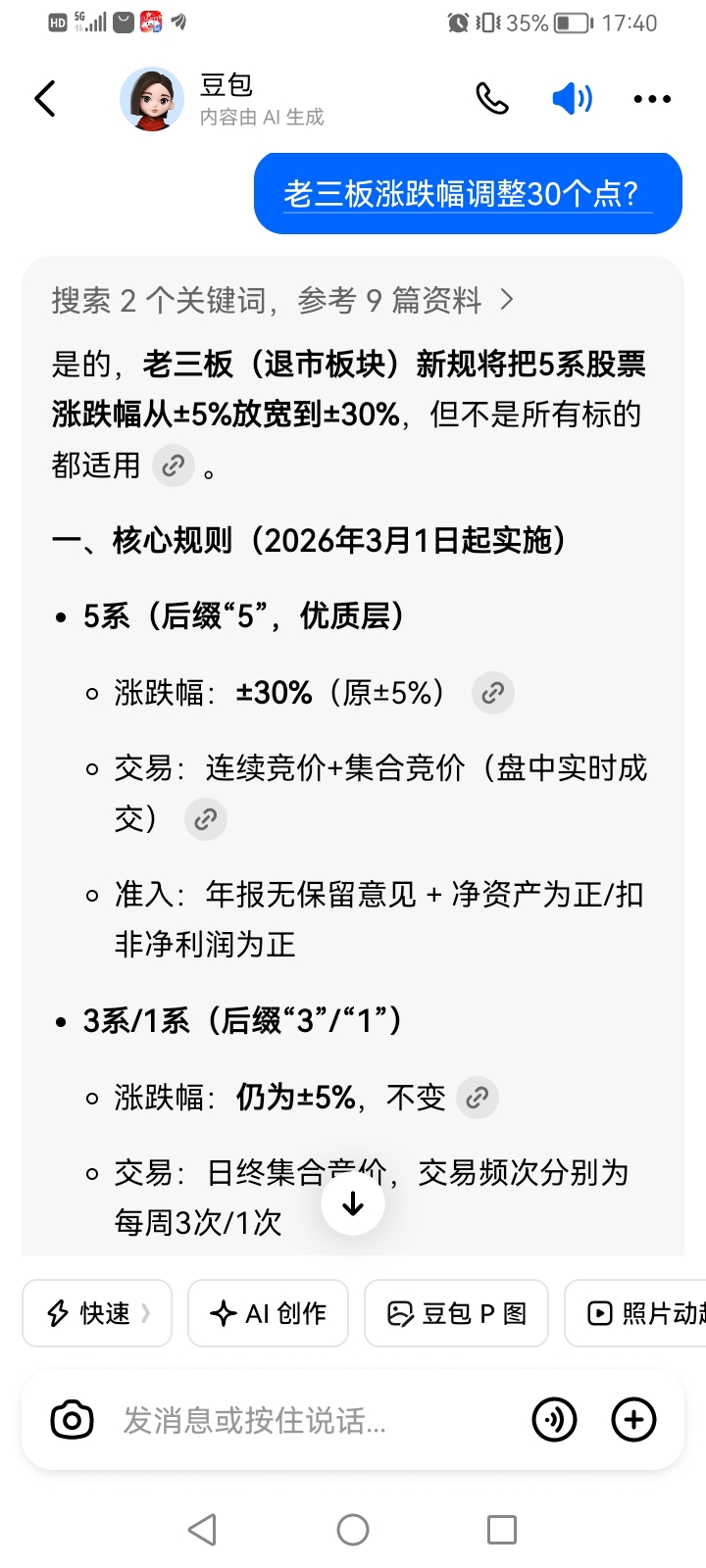 2026年3月1号起老三板涨跌幅调整到30%,真的假的呢?我用豆包搜到的!