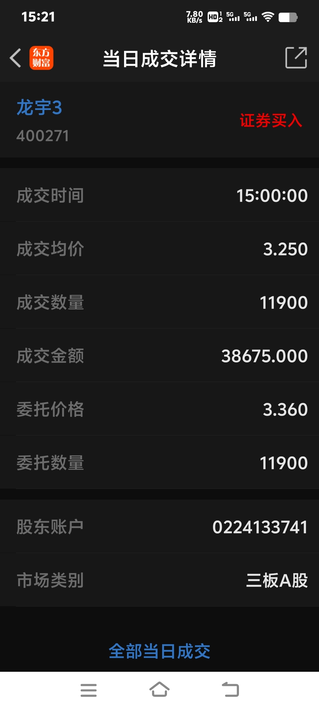 $龙宇3(SZ400271)$ 昨天下午挂单3.36买的就一笔成交了!