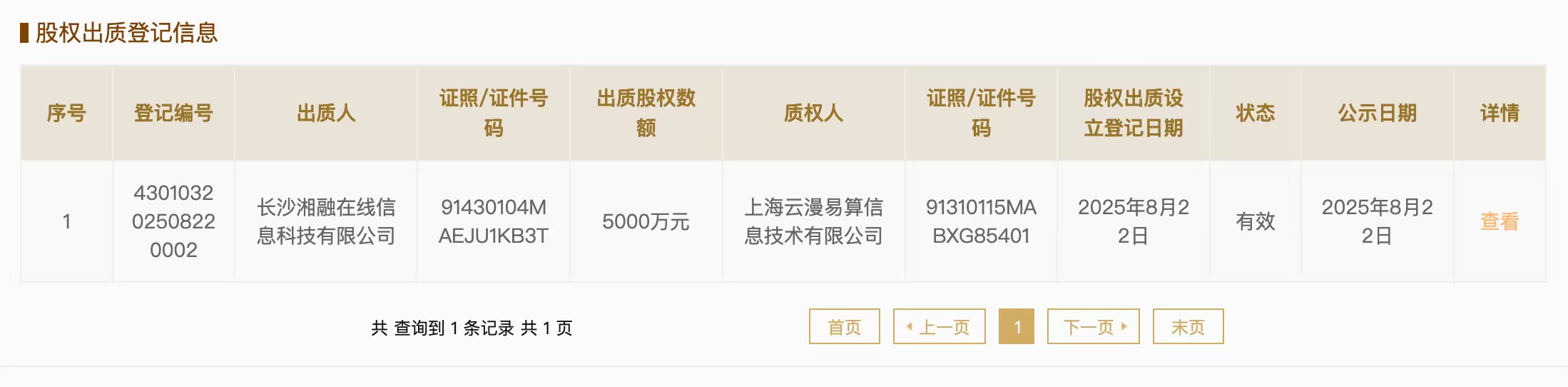 发现一个隐藏信息2025年8月,湘江在线母公司将湘江在线100%股权质押给了云漫
