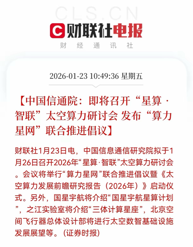 利好!重磅利好!太空算力引爆算力基建新赛道,“星算·智联”会议或成产业爆发前夜的号角!在AI算力需求井喷的当下,一场由中国信通院主导的“星算·智联”太空算力研讨会,即将在1月26日成为点燃资本市场的新火种。这场会议不仅将发布“算力星网”联合推进倡议,更会启动《太空算力发展前瞻研究报告(2026年)》,直接推动算力基建从地面走向近地轨道,打开万亿级产业新空间。