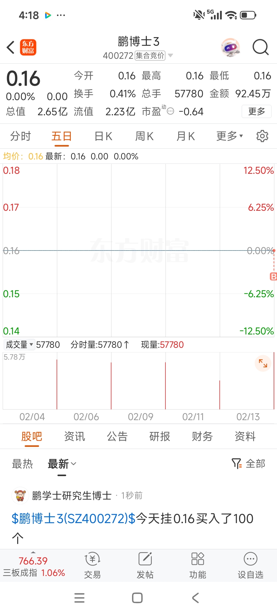 $鹏博士3(SZ400272)$ 今天挂0.16买入了100个