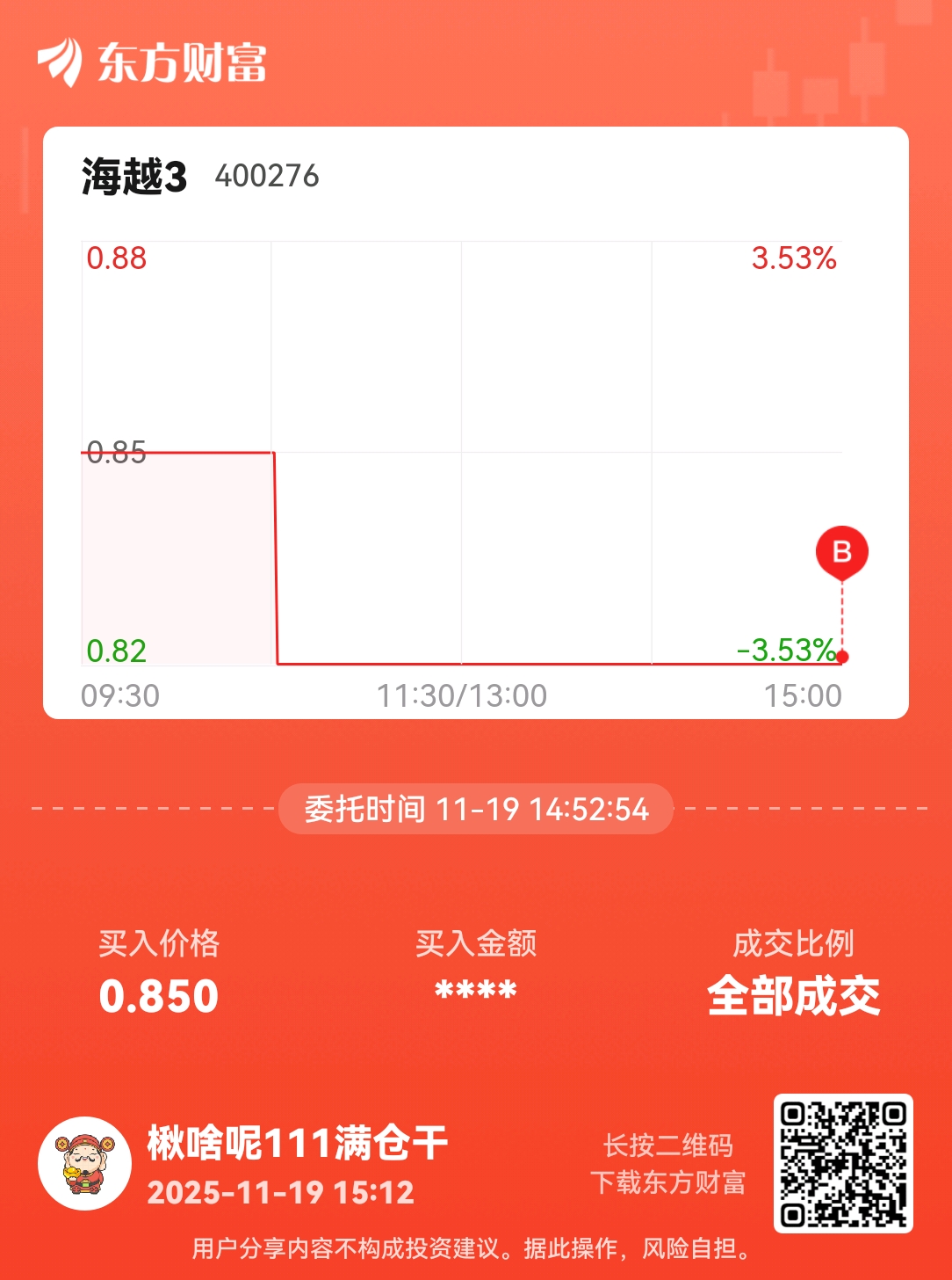 温馨提示: 1.根据《证券法》规定,禁止编造、传播虚假信息或者误导性信息,扰乱证券市场;2.用户在本社区发表的所有资料、言论等仅代表个人观点,与本网站立场无关,不对您构成任何投资建议。用户应基于自己的独立判断,自行决定证券投资并承担相应风险。《东方财富社区管理规定》