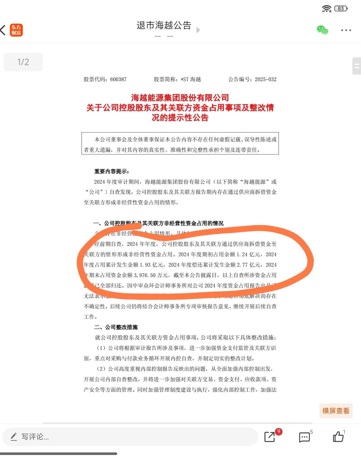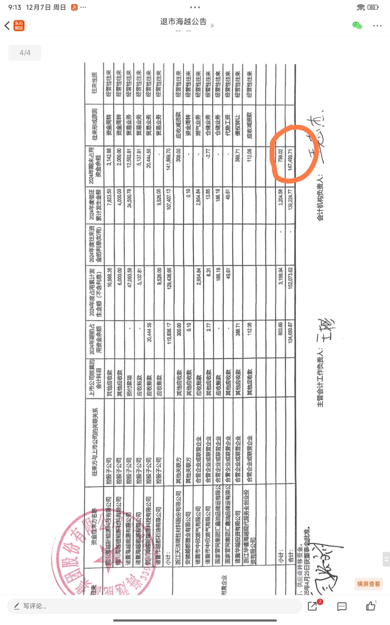 $海越3(SZ400276)$ 难怪退市后还被立案调查,真是死性不改,原来2024年还有控股股东资金占用。占用的金额两个公告数据还打架,公司的公告是3976.5万。中审众环发的公告是147499.71万元。相差37倍。买它的唯一理由是净资产高,可是这个净资产的水分到底有多高?还敢买吗?果子能无耻到这个地步吗?