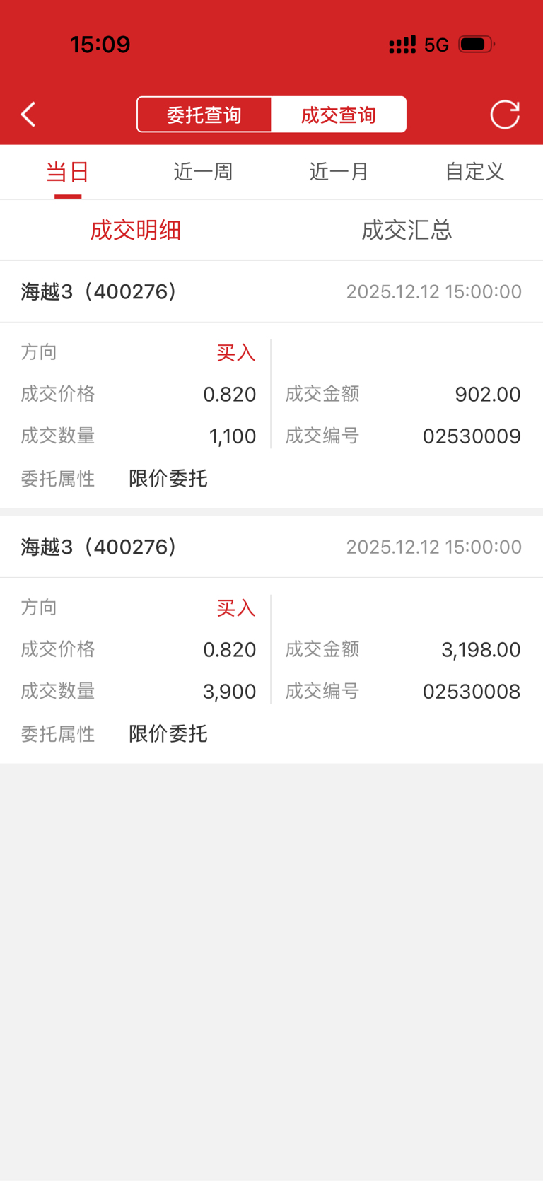$海越3(SZ400276)$ 又买了5000股,成交单显示有两个散户割肉卖出。看样子散户出逃严重啊!