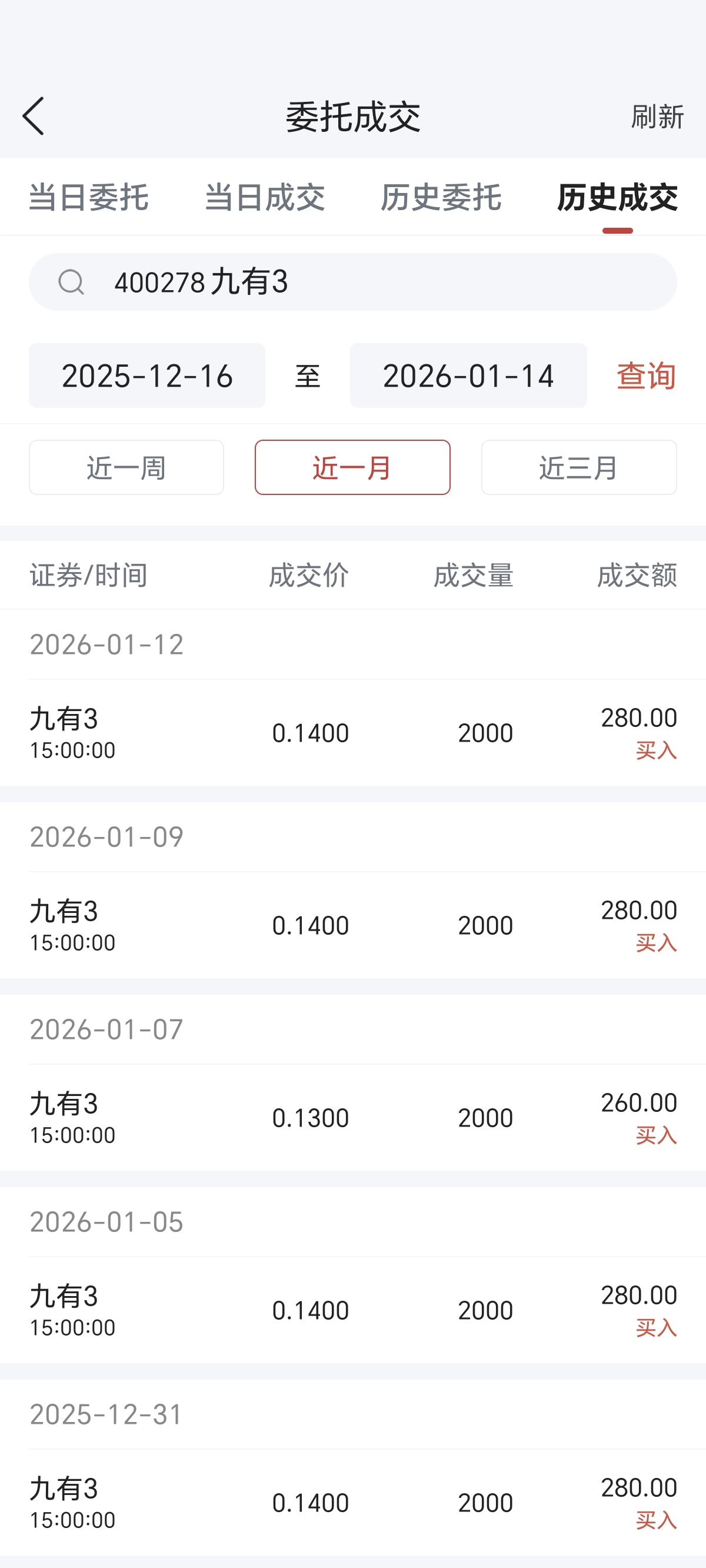 $九有3(SZ400278)$ 继续每交易日零钱300元买入2000股,是0.13或0.14成交由你主力决定,我更希望0.13,因为便宜。