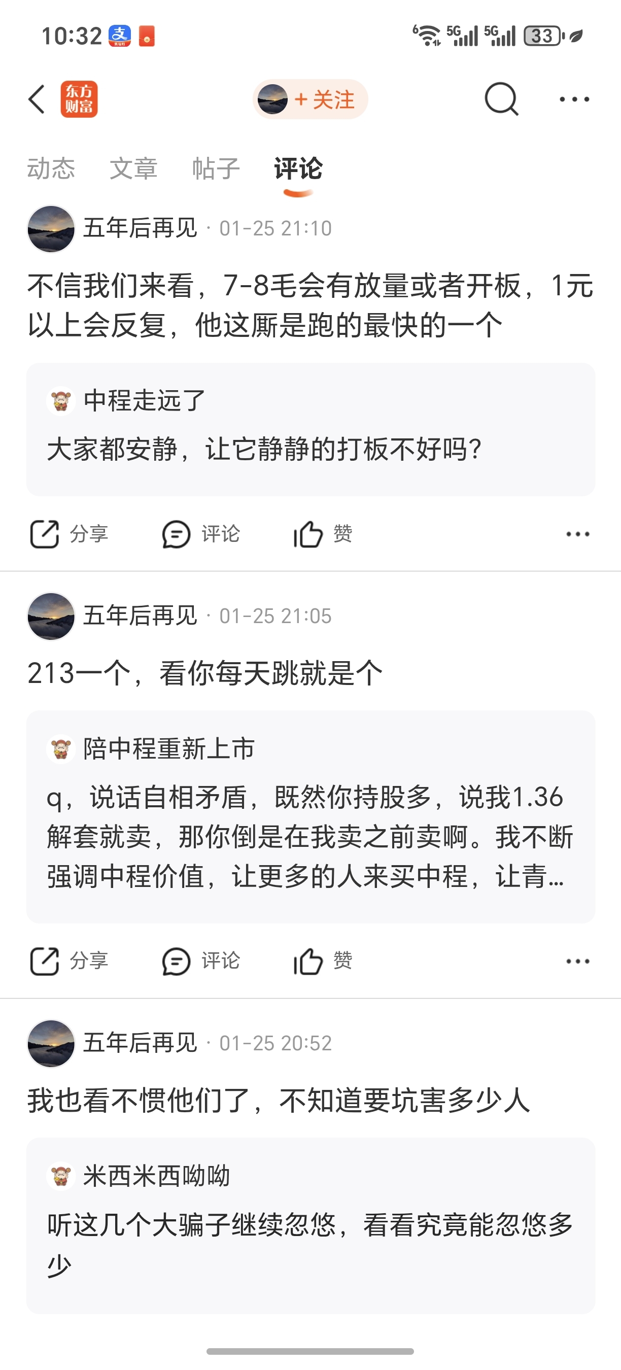 $中程5(SZ400279)$ 警惕那个五年后再见的是因深套想补仓也在疯狂唱空。出来受死吧,为你的食言和居心不良自裁吧,下周一就8毛1了,你发誓的7-8毛就没有开板也没有放量。上一个是发誓5-6毛绝对开板的中炬走远了,已经了结了。