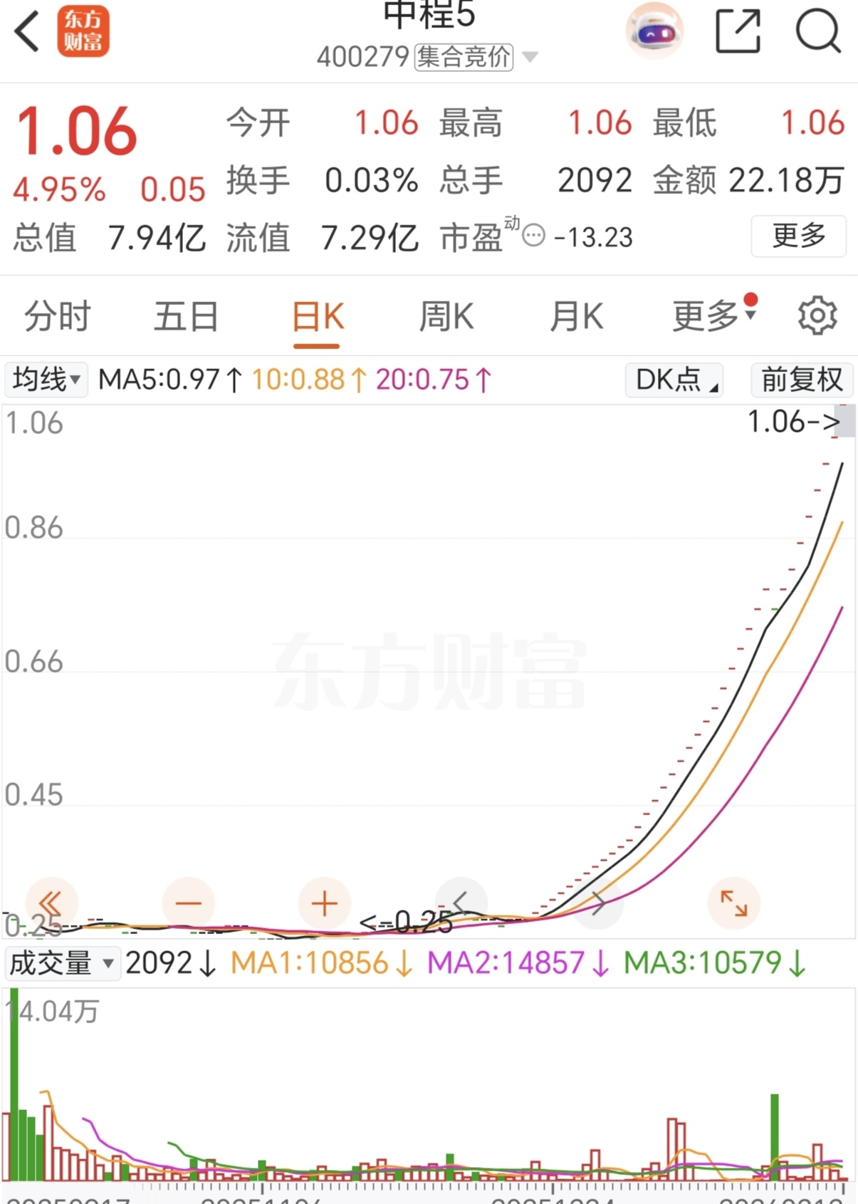 $中程5(SZ400279)$ 中程前世是300208从110.85跌倒2毛4,今生是400279从2毛5刚涨到1.06,不及前世高点百分之一!青岛政府加油啊!!#强势机会# #周度策略# #复盘记录# #炒股日记# #收盘点评#