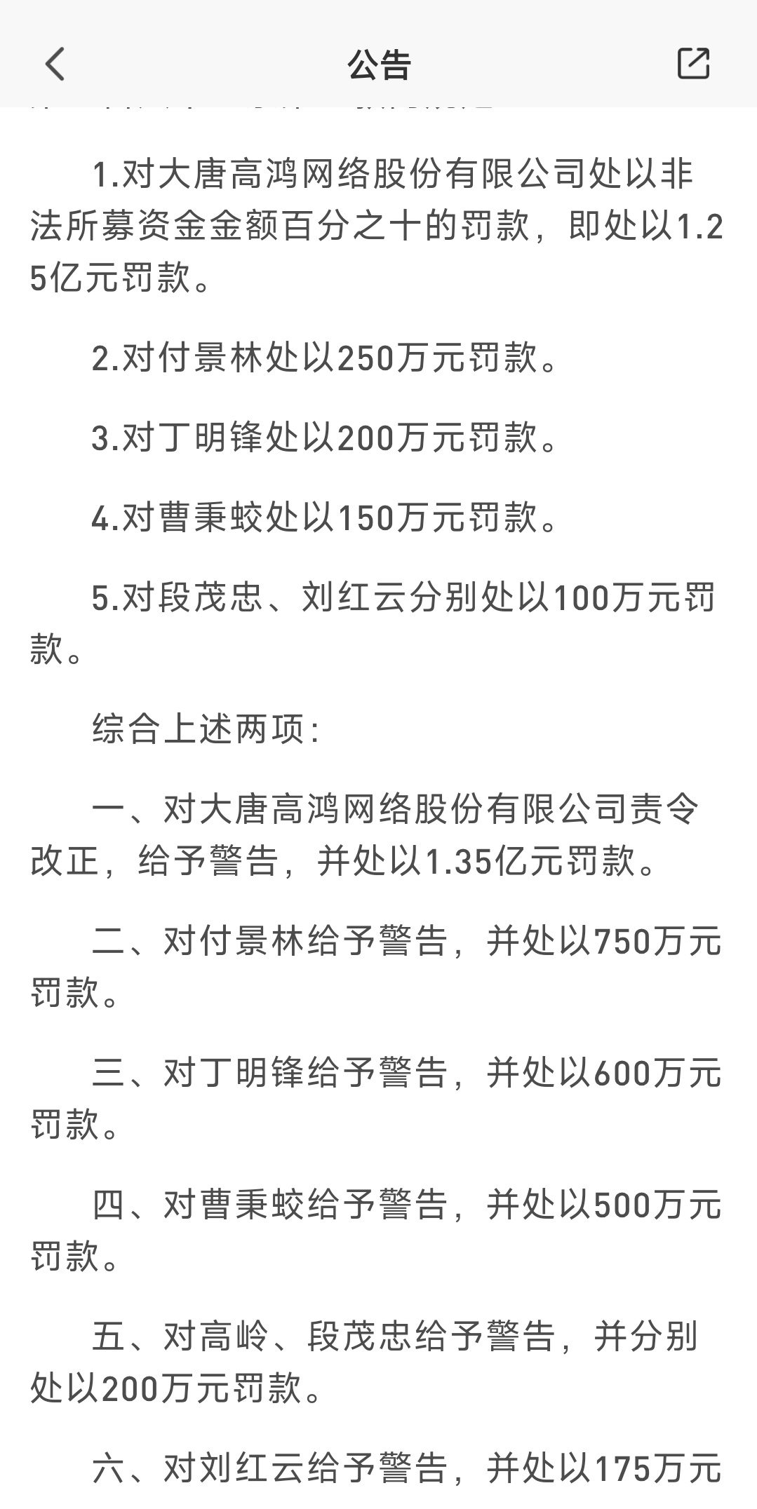 $高鸿3(SZ400283)$ 家人们,可以理解成23号为什么开始放量?就是有公告处罚下来,对大唐高鸿网络股份有限公司责令改正,给予警告,并处以1.35亿元罚款,就是家人们常说的利空落地就是利好,所以连续三天开始放量,上涨
