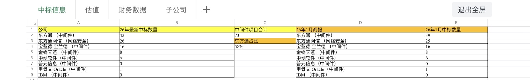 一句话总结,东方通中间件今年一月中标39个项目,比其它公司加起来还多。东方通网信今年一月中标25个项目。今年的增速目前看依然非常快。