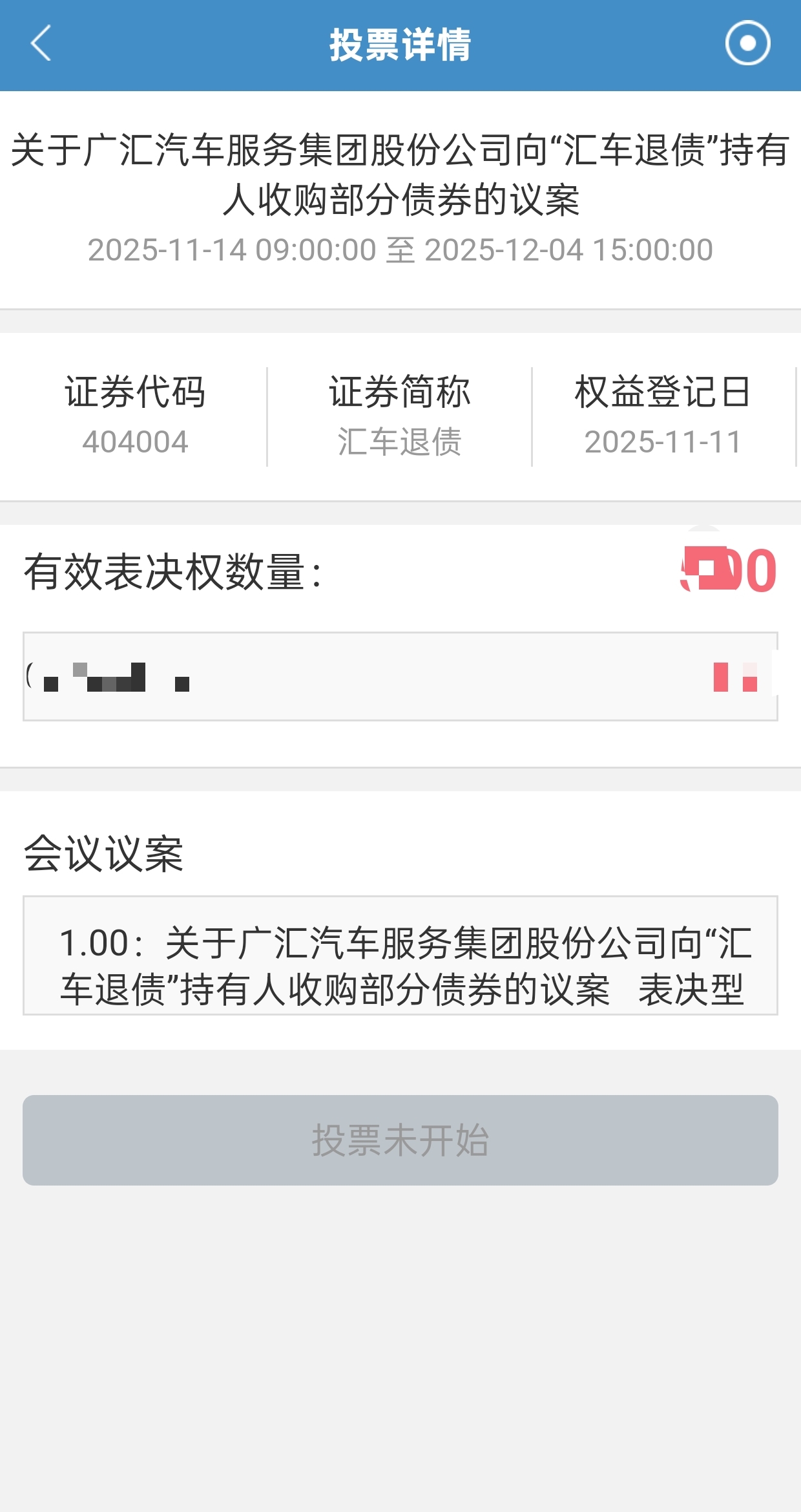 $汇车退债(SZ404004)$ 投票已经上线。可以看到自己的数量。大家尽快打开看看,确定数量。如果能看到这个页面,就是100P的确权了。14日上九时,正式开始,可以根据自己的意愿选择相应的条目。