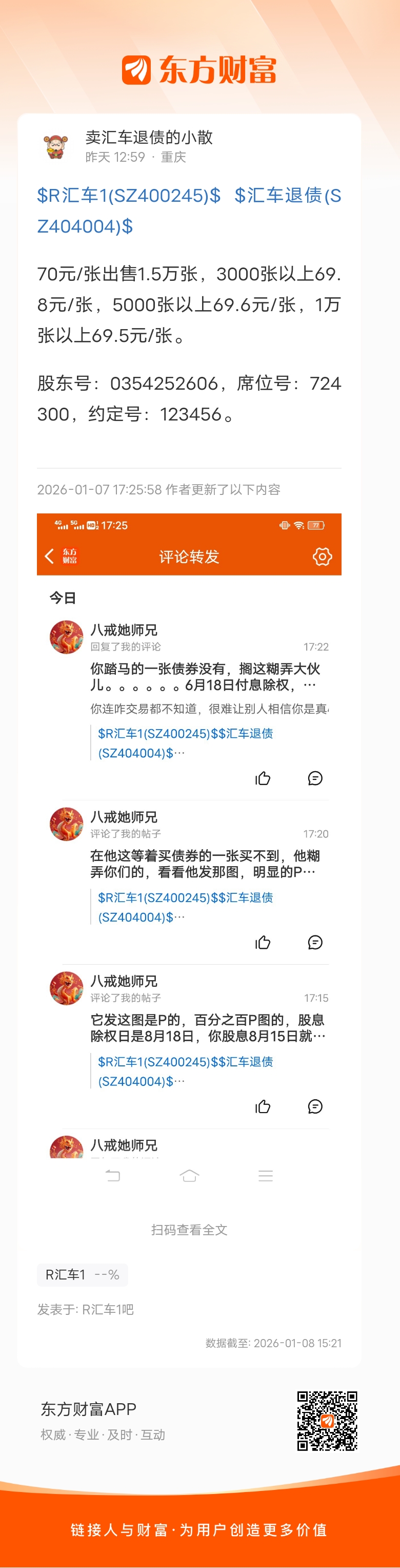 $汇车退债(SZ404004)$$R汇车1(SZ400245)$继续出,贴吧确实鱼龙混杂,真假难辨,有假收的,也有假卖的。理解吧友的合理质疑,但是拒绝无端指责。我不去评判其他人到底是不是真买还是真卖,我这里保证是真卖,今晚到时间就给留下三号的朋友挂隔夜单。如果能出掉这15000张固然最好,如果出不掉,下周我就部分转股卖出,部分继续出。