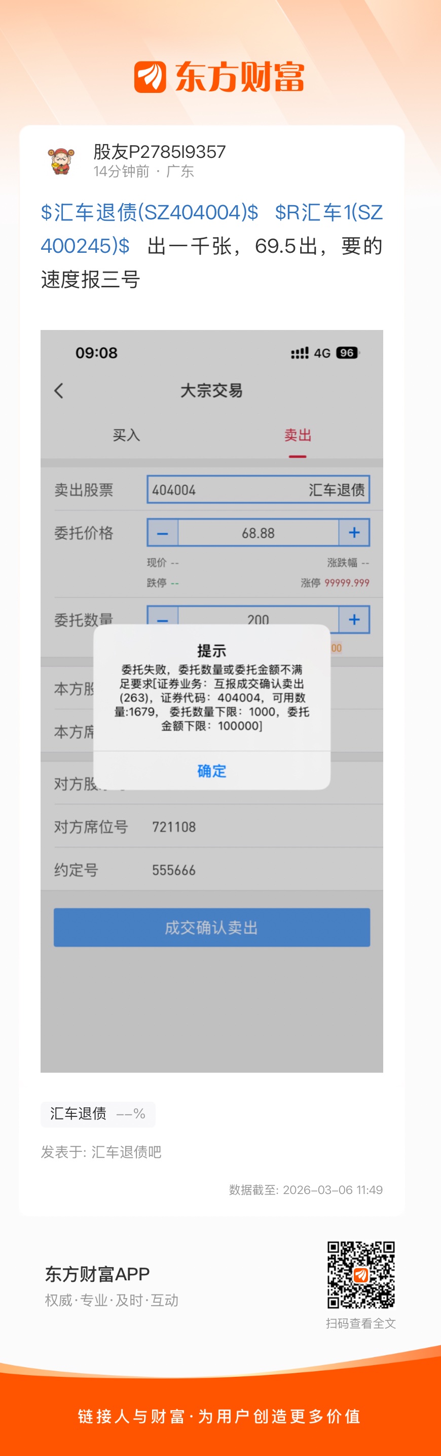 $汇车退债(SZ404004)$  $R汇车1(SZ400245)$  出一千张,69.5出,要的速度报三号