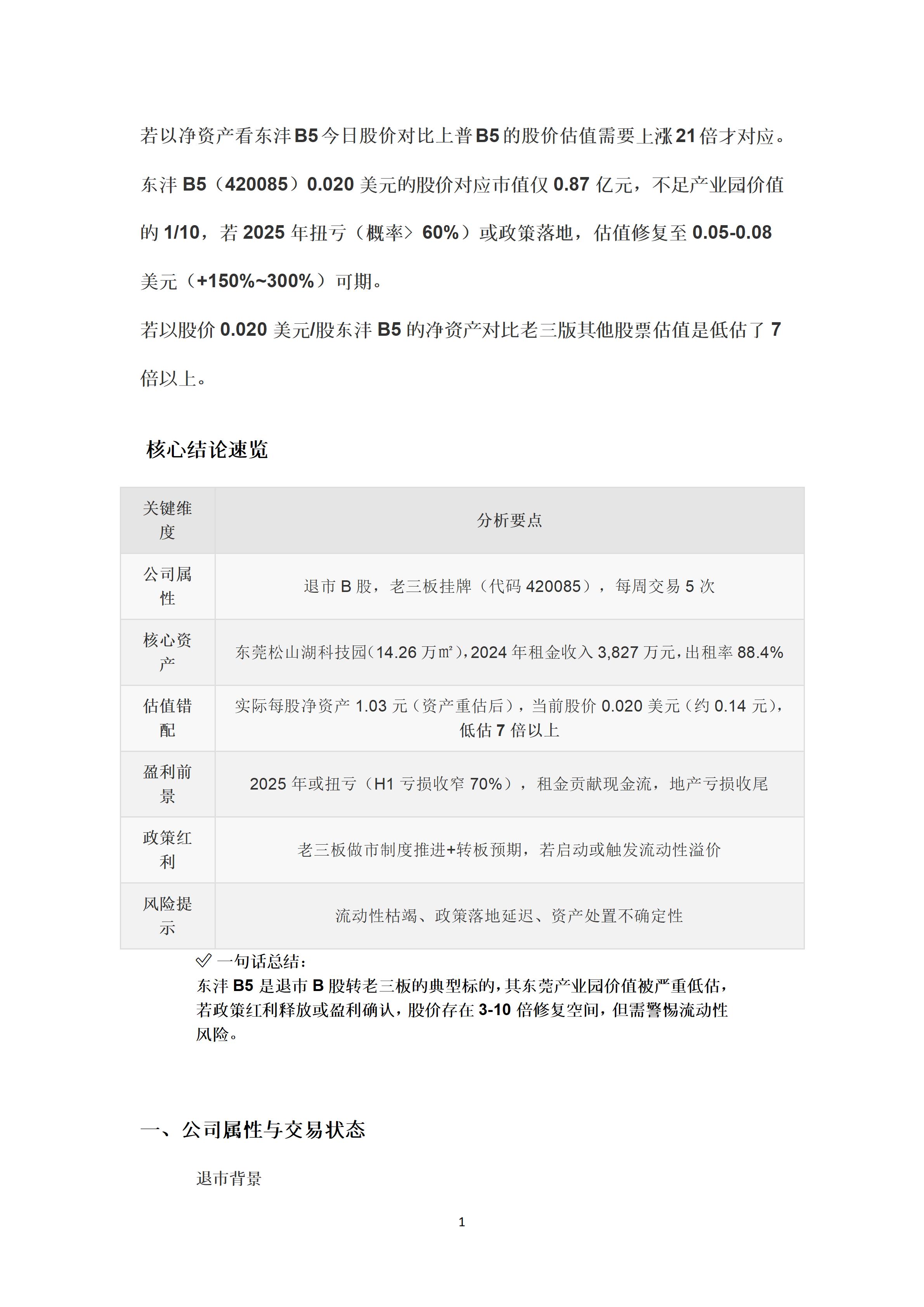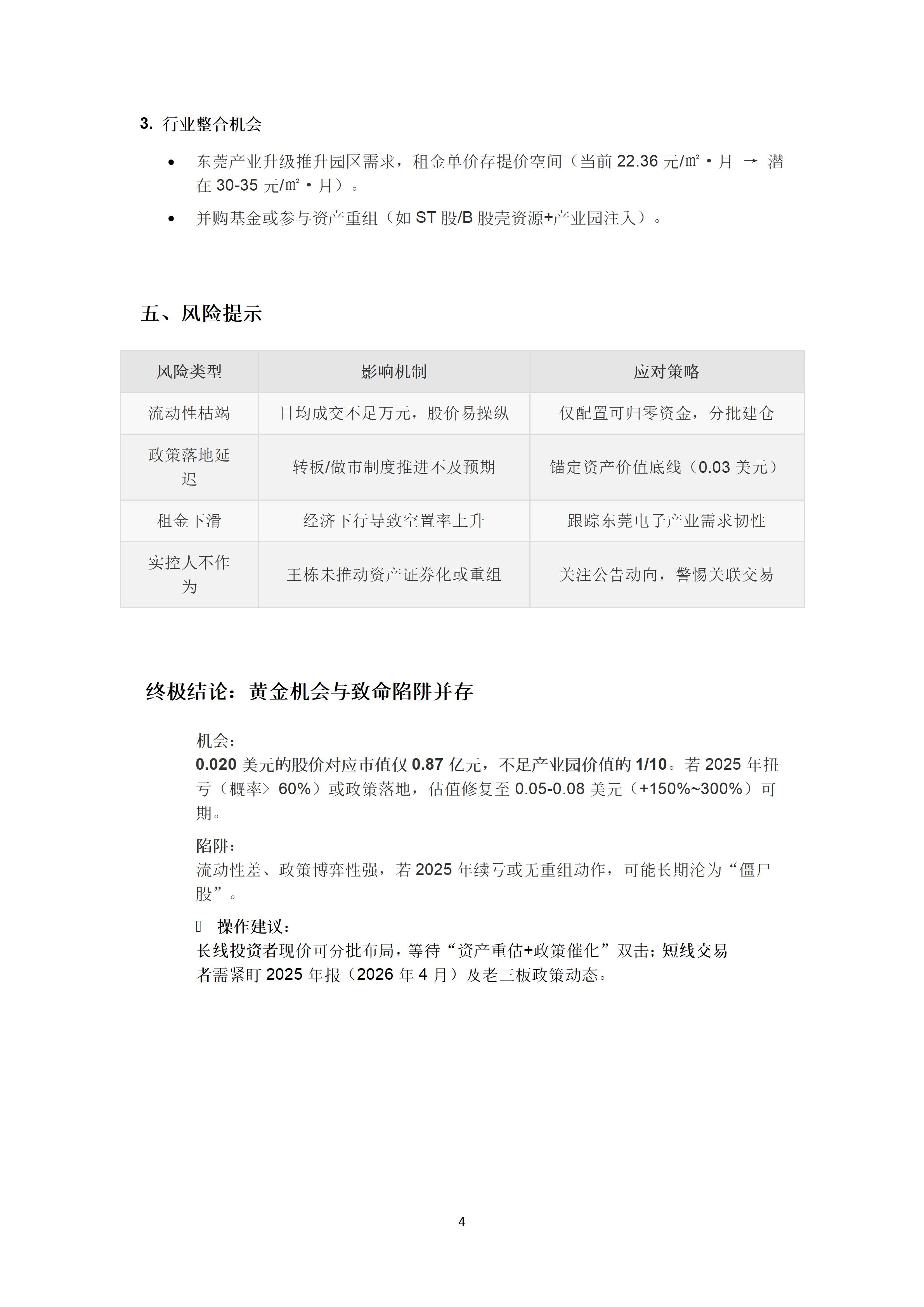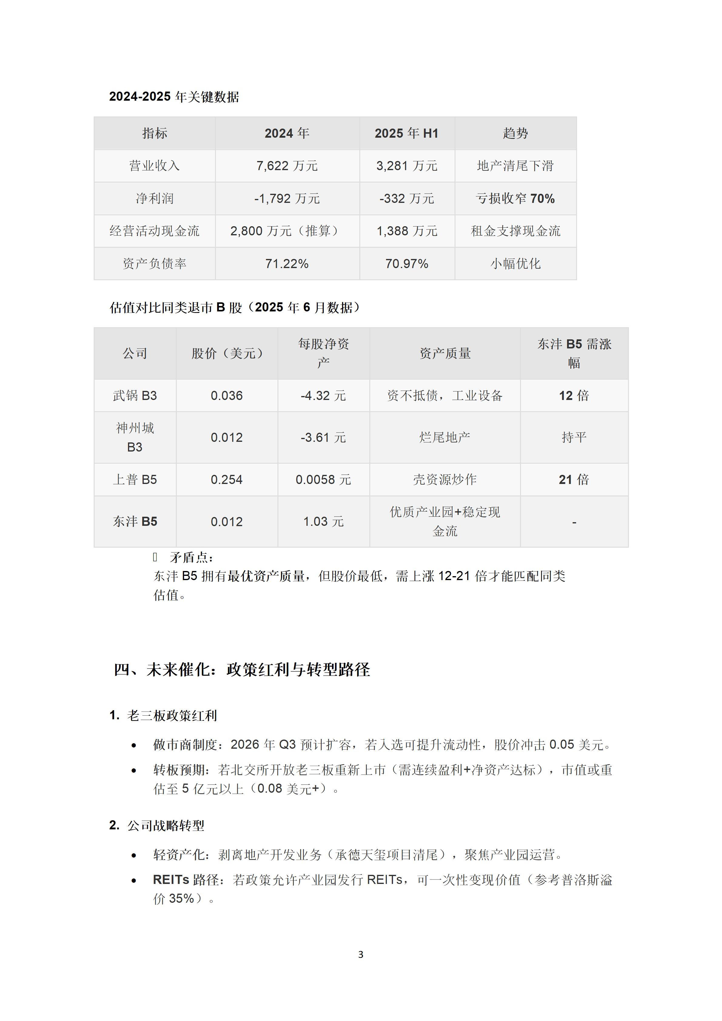 东沣B5(420085)0.020美元的股价对应市值仅0.87亿元,不足产业园价值的1/10,若2025年扭亏(概率>60%)或政策落地,估值修复至0.05-0.08美元(+150%~300%)可期。