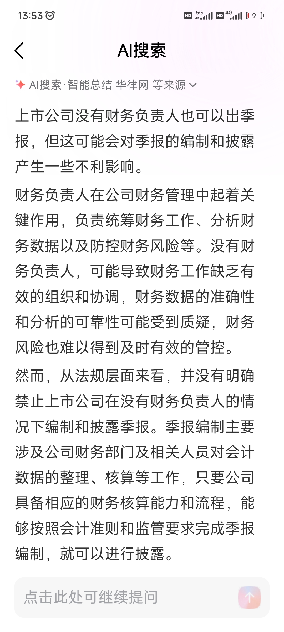 没有财务负责人也可正常出季报,所以公司季报随时可能出。