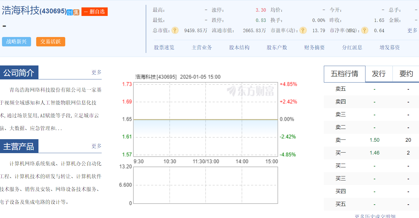 浩海科技2026年开盘零交易!2025年收盘价成为2026年开盘价!开盘有点高!