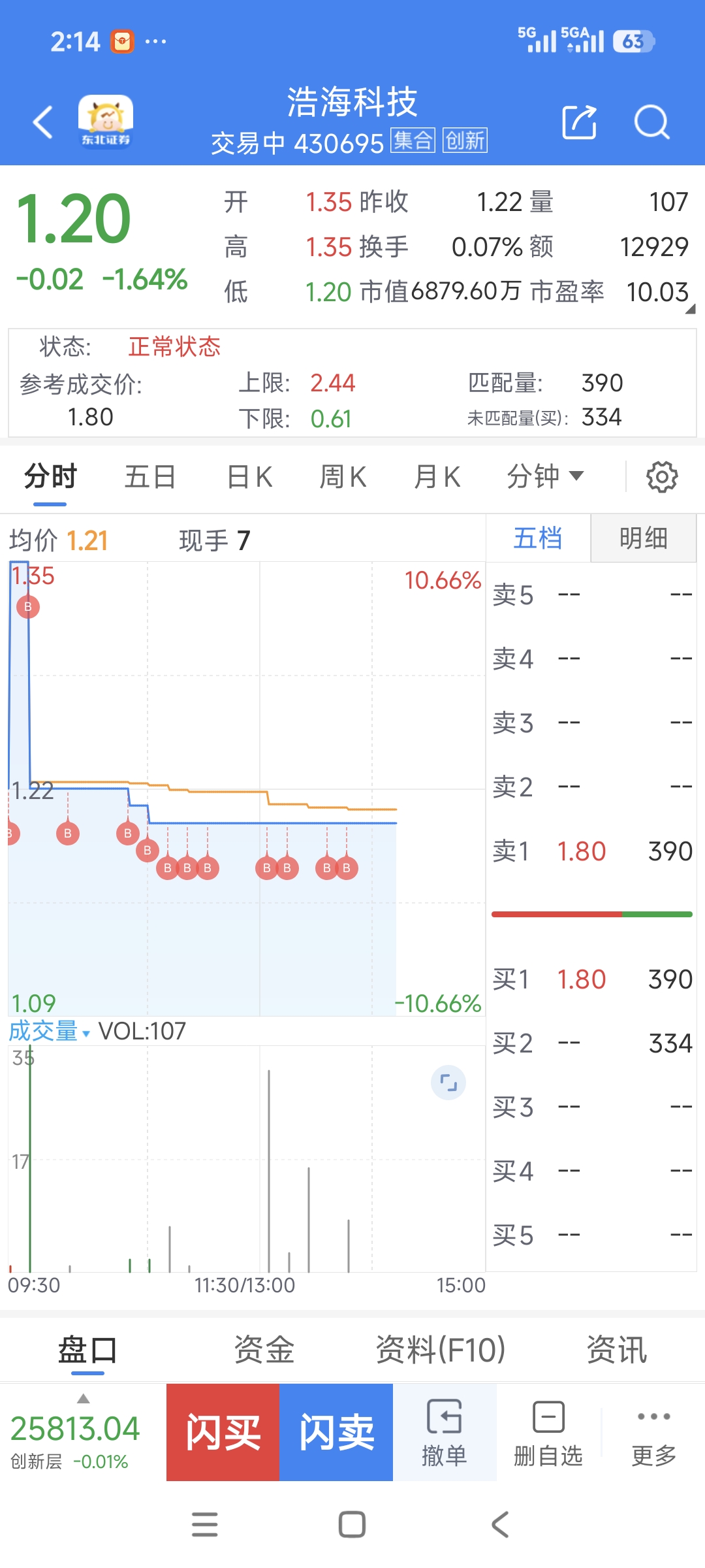 浩海科技下午有一次试盘,抛盘不到4万股!向上试盘说明有庄家介入!看看抛盘情况!