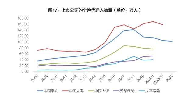 负债端主要就是保险公司的保费收入情况。保险依赖代理人销售,原本大家以为是疫情影响了代理人线下业务拓展,但如今国内疫情可控了,大家发现保险公司的保单收入还是没有改善,保险代理人数量还是在减少。