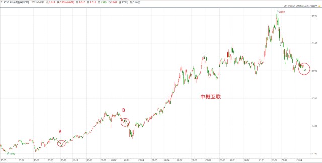 拉长时间看,中概互联的回报率挺不错的,但短期陷入困境确实会让人很煎熬。我在图中列了A点和B点,A点刚好就是下跌后触底了,B点只是下跌中途的反弹,后面还有一波下跌。短期走势很难判断,但只要认可我们投资的资产是足够优秀且买入的估值合理,赚钱那是迟和早的区别。