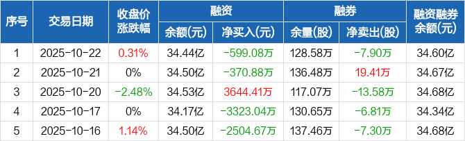 浦发银行:融资净偿还599.08万元,融资余额34.44亿元(10-22)