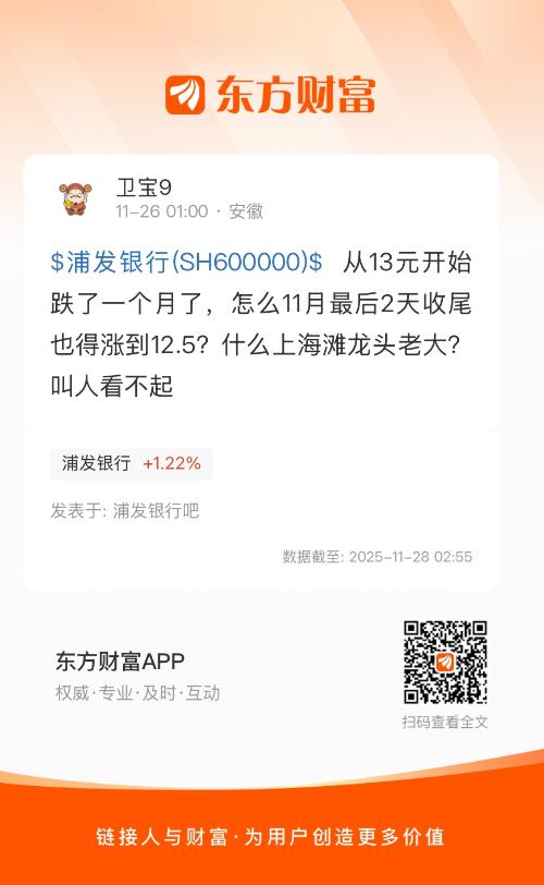 $浦发银行(SH600000)$ 从13元开始跌了一个月了,怎么11月最后2天收尾也得涨到12.5?什么上海滩龙头老大?叫人看不起