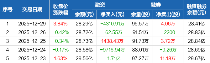 浦发银行:融资净偿还4310.91万元,融资余额28.29亿元(12-29)
