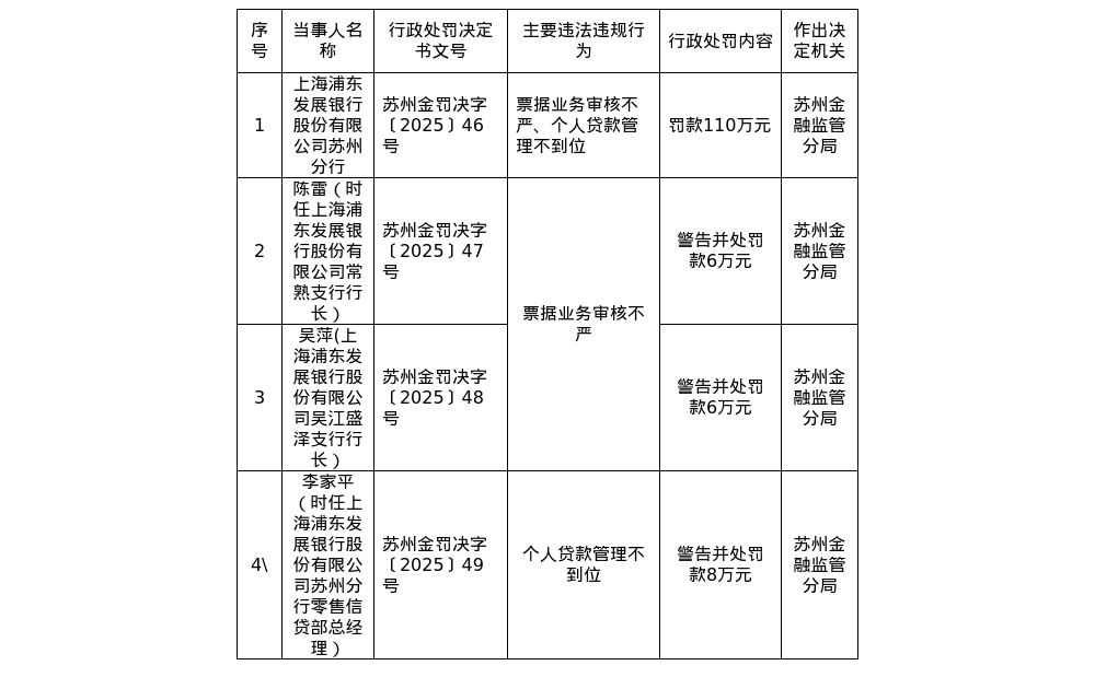 罚单显示,浦发银行苏州分行的主要违法违规事实(案由)为:票据业务审核不严、个人贷款管理不到位。
