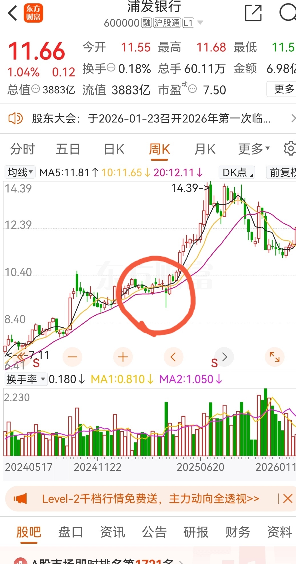 $浦发银行(SH600000)$ 它目前走的就是这一段路程,很大可能,打圈位置