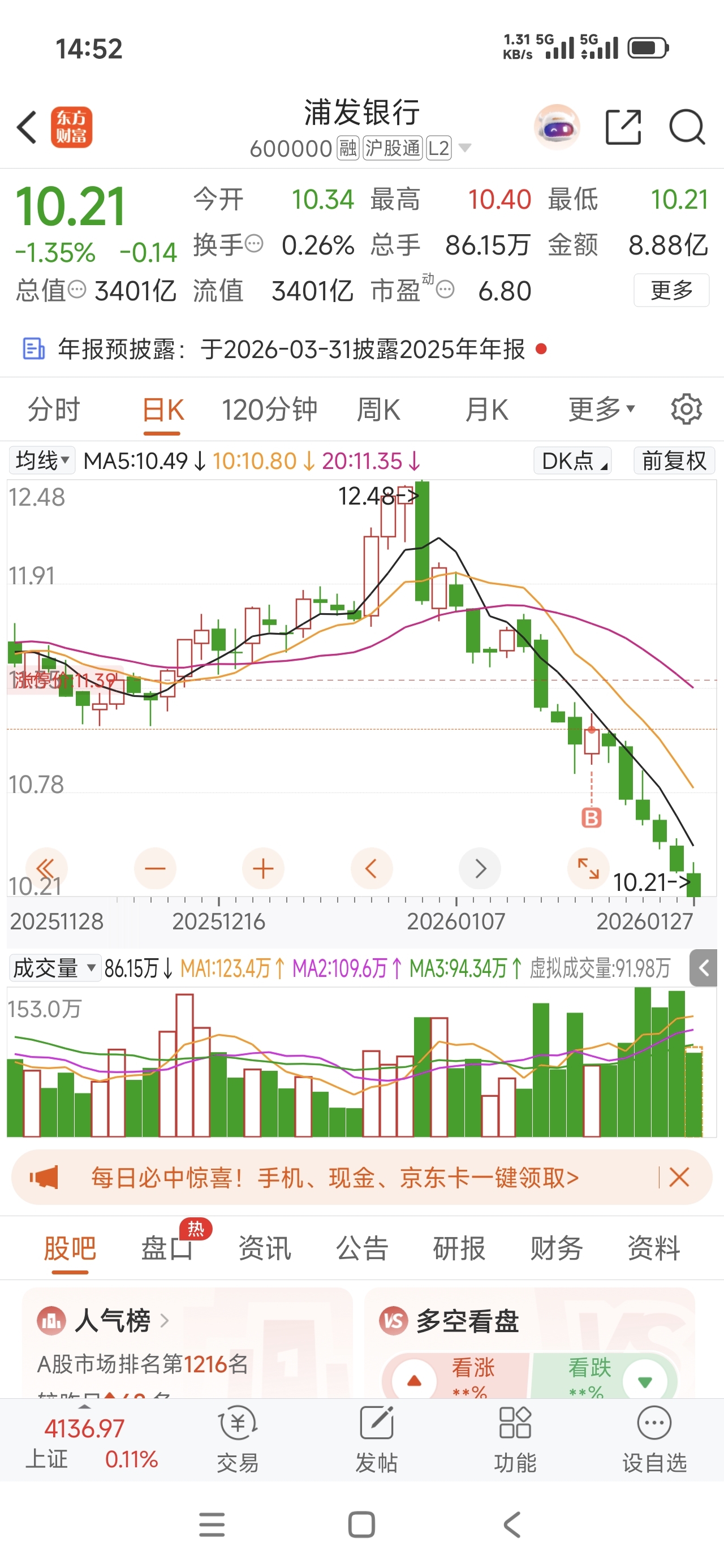 $浦发银行(SH600000)$ 都是我不好,本来都要抬头了,又硬生生让我给按下去了