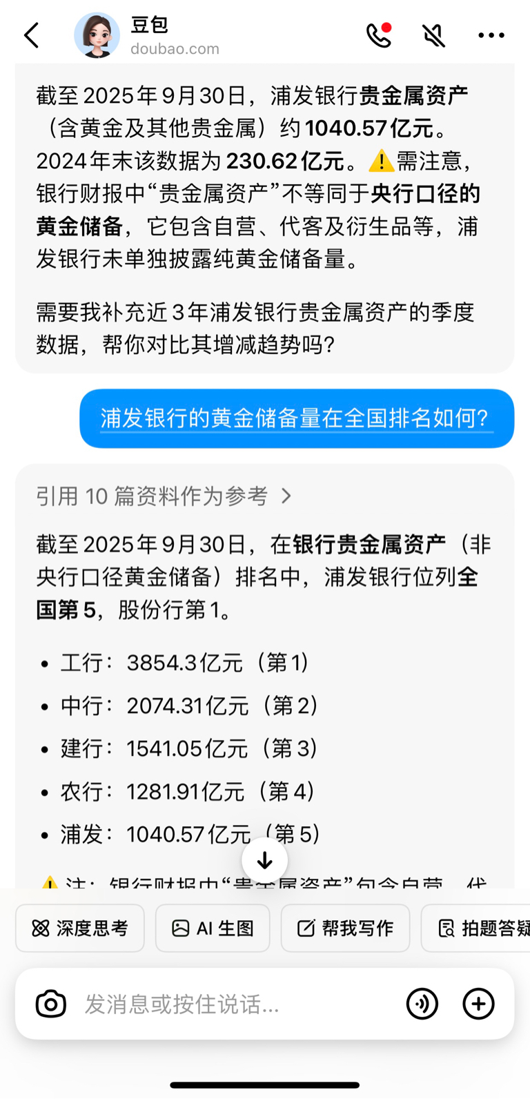 $浦发银行(SH600000)$ 浦发银行去年9月分贵金属资产是1040亿元,数据是去年的,自然按去年的价值估算,按今天黄金的价值算,大概值1500亿元左右,如果这部分贵金属中银的成分不少,价值应该更高,浦发银行目前市值3300亿,这,妥妥的破净股,也是黄金概念了,品品~