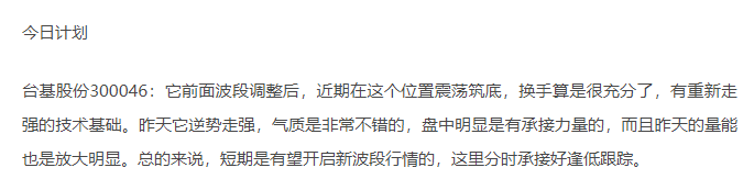 台基股份300046:它昨天震荡为主,表现一般。这里最好是能走强阳线了,这才是短线最好的状态,那就继续跟踪波段反弹。不强反弱的话,算是不及预期,就考虑落袋了。上周三挖掘了它,当时它刚刚底部反转,还是比较及时的,近期整体反弹表现很不错。
