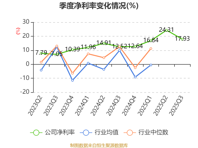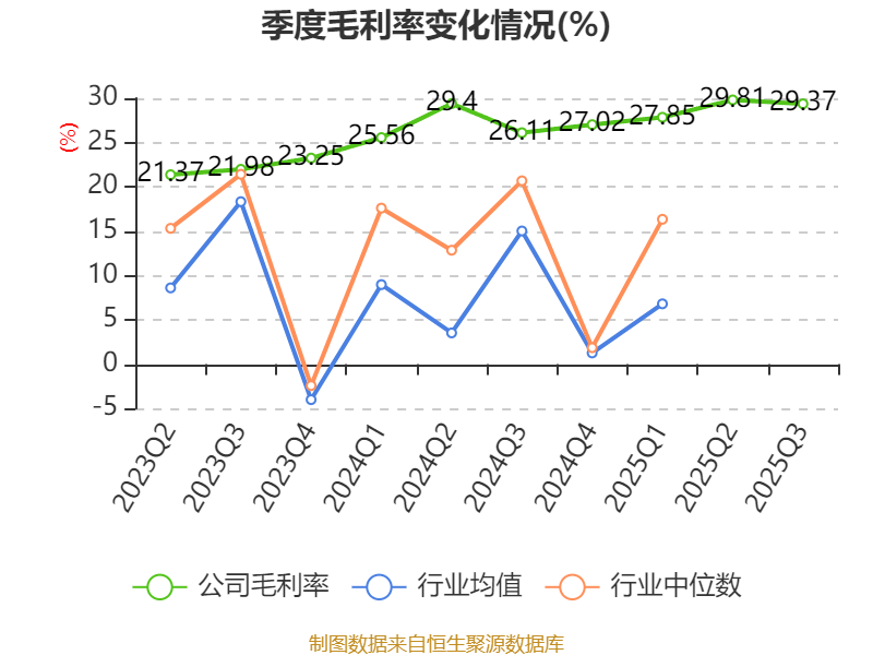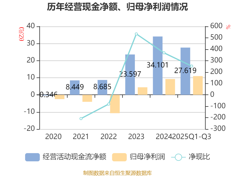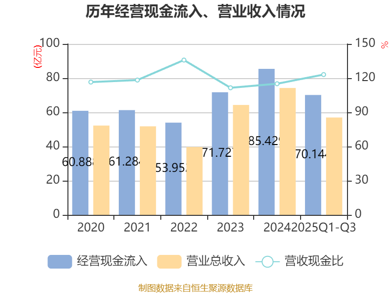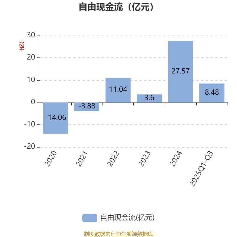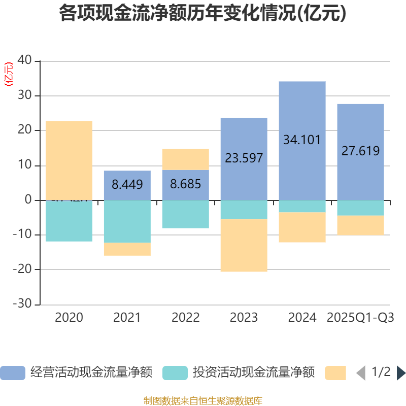 2025年前三季度,公司经营活动现金流净额为27.62亿元,同比下降0.76%;筹资活动现金流净额-5.64亿元,同比减少2772.49万元;投资活动现金流净额-4.45亿元,上年同期为-3.67亿元。