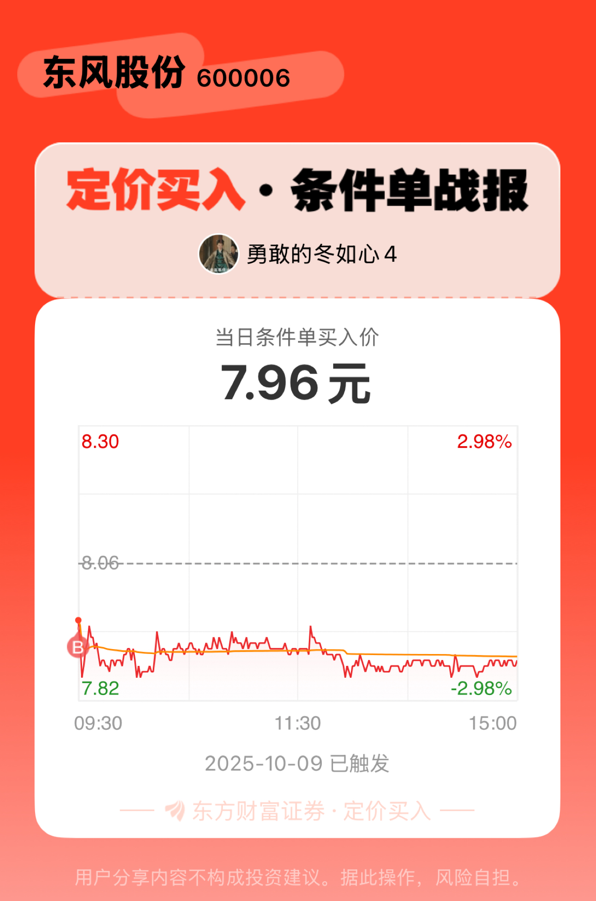 #条件单交流# #定价买入晒单# 我方派出一个定价买入条件单,立时就征服了$东风股份(SH600006)$