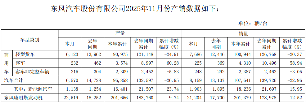 12月8日, 东风股份 (600006)发布的2025年11月份产销数据快报显示,单月及今年前11月产销数据双双大幅下滑。