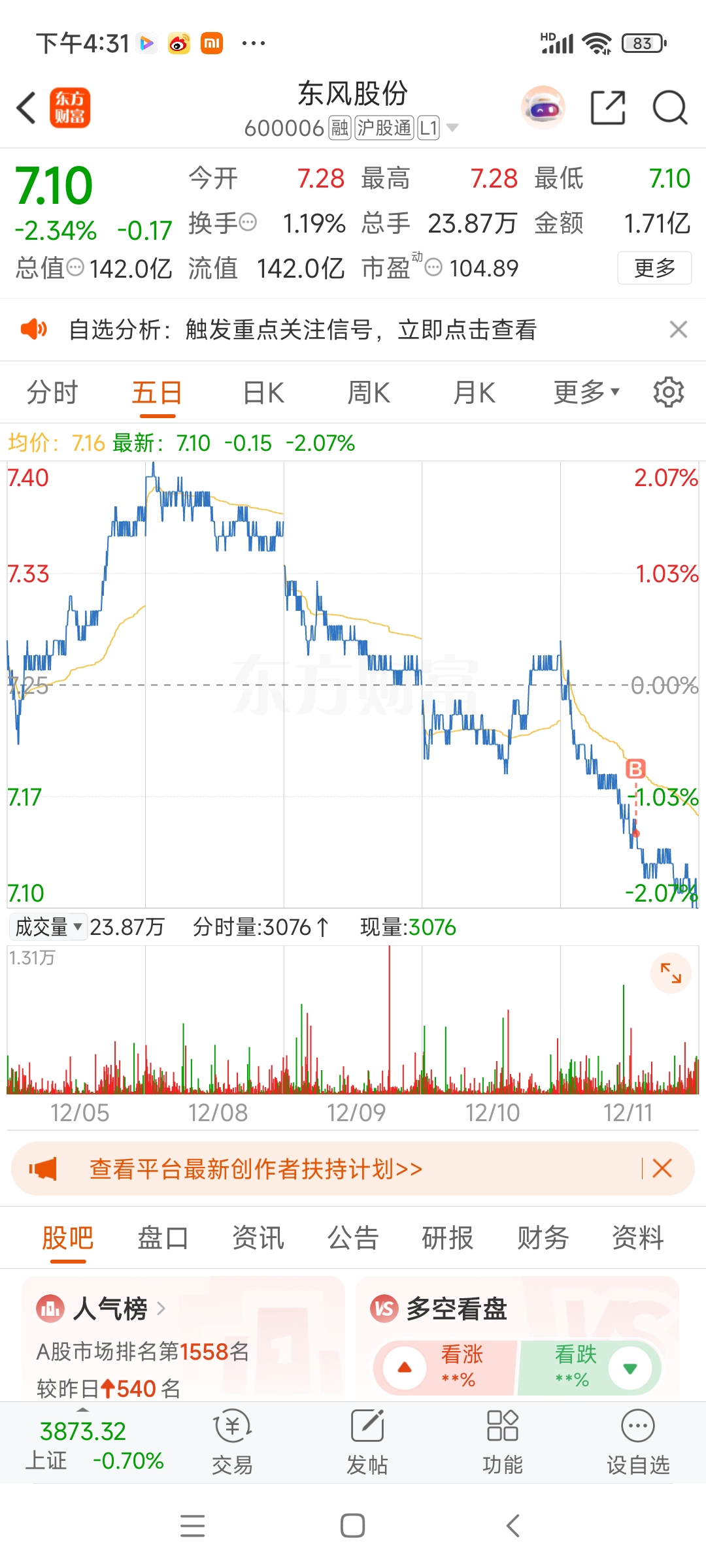 $东风股份(SH600006)$ 好多天不操作了!都感觉手生了!