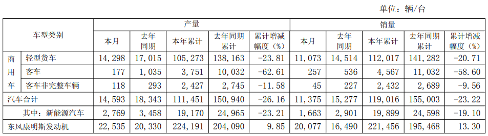 东风股份2025年12月产、销量同比双降