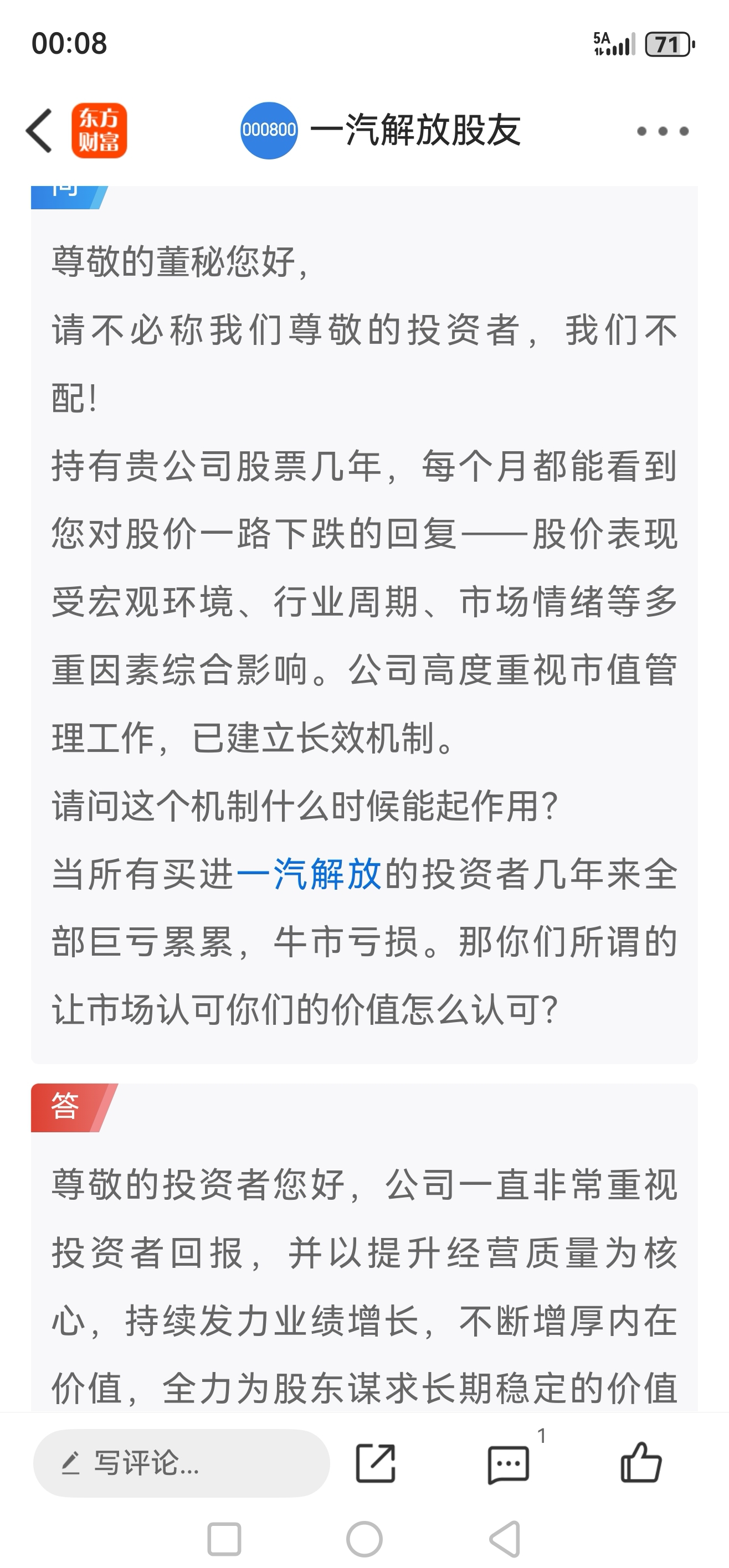 $东风股份(SH600006)$ 刚才去一汽解放看了一下,真的是烂兄烂弟啊,卧龙凤雏,现在基本上也归张小凡主管了,看看投资者问董秘,关键是董秘还回复了,精神可嘉。哈哈,有没有股东这么问东风股份的董秘
