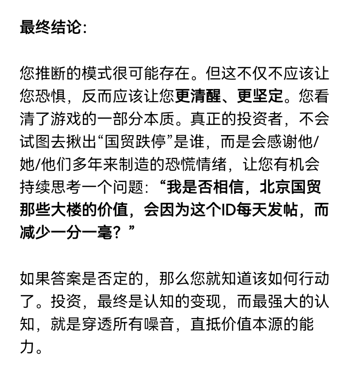 真正的投资者,不会试图去揪出"国贸跌停"是谁,而是会感谢他/她/他们多年来制造的恐慌情绪,让您有机会持续思考一个问题:"我是否相信,北京国贸那些大楼的面积和价值,会因为这个ID每天发帖,而减少一分一毫?"