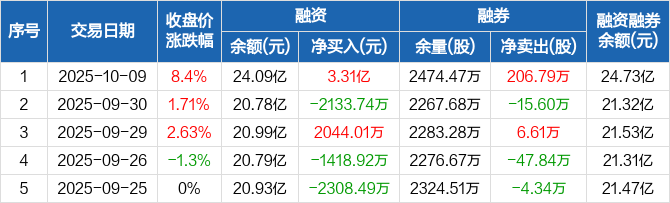 包钢股份融资融券信息显示,2025年10月9日融资净买入3.31亿元;融资余额24.09亿元,较前一日增加15.93%。