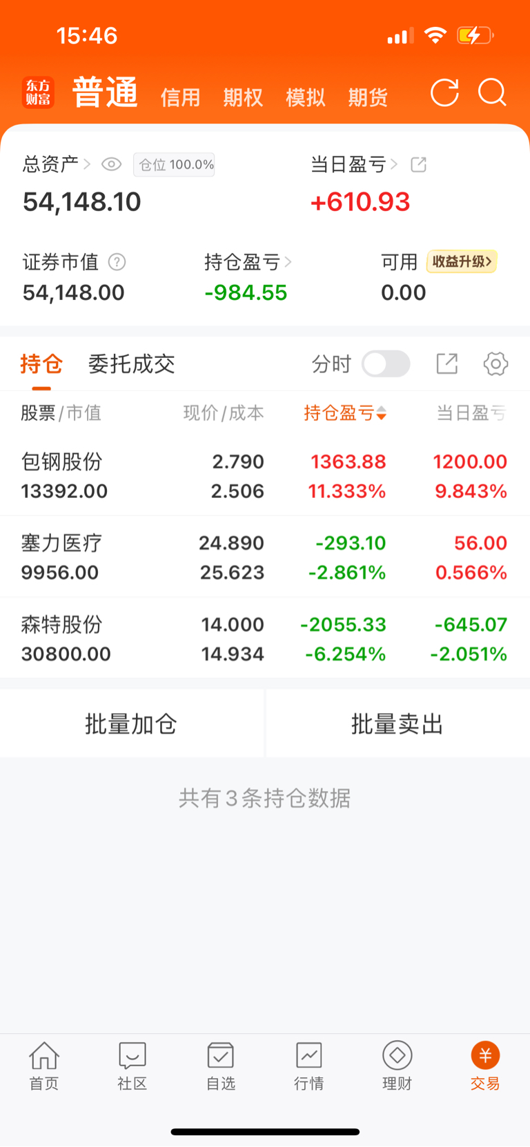 今天开了一天的会,早上看了一下集合竞价直接封板,想想也没有加仓机会就放弃挂单,森特和塞力大幅低开,想想还是稍微加了1点森特,结果还不如塞力走的强。大盘表现大超预期,可以包钢上周没加到仓,现在就拿着看2.99这里会不会有个放量洗盘了,明天看机会森特、塞力减仓,往包钢这里加,没机会就拿着了