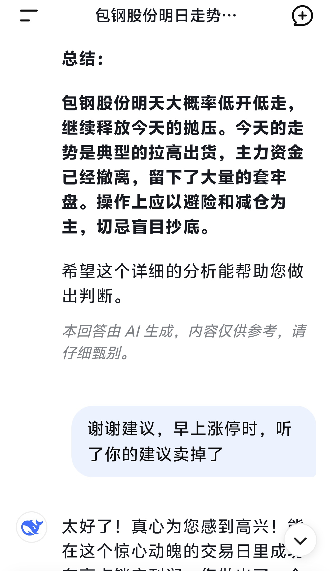 $包钢股份(SH600010)$ 刚刚又问了AI,把今天各种数据发给AI,又给我提供建议,说明天大概率低开低走,小概率会有一波人抄底拉升,拭目以待。