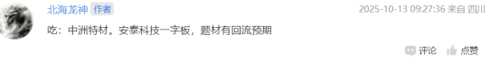 中洲特材:高温合金+核电航空+设备制造。公司专门搞钴基、镍基、铁基这些高温耐蚀合金材料及制品的研发、生产和销售,产品用在核电领域,是核电概念标的。盘面表现上,该股在10月9日强势涨停,本周一低开高走再度拉出大阳线,核电板块龙头安泰科技一字板,如果这个位置继续走强的话,会进一步确认短期的强势。今天虽然有回调,但考虑到今天大盘比较差,这种回调整体也是可以接受的。