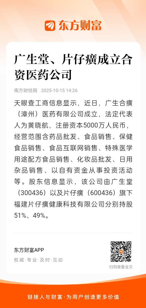 南方财经10月15日电,天眼查工商信息显示,近日,广生合癀(漳州)医药有限公司成立,法定代表人为黄晓航,注册资本5000万人民币,经营范围含药品批发、食品销售、保健食品销售、食品互联网销售、特殊医学用途配方食品销售、化妆品批发、日用杂品销售、以自有资金从事投资活动等。股东信息显示,该公司由广生堂(300436)以及片仔癀(600436)旗下福建片仔癀健康科技有限公司分别持股51%、49%。
