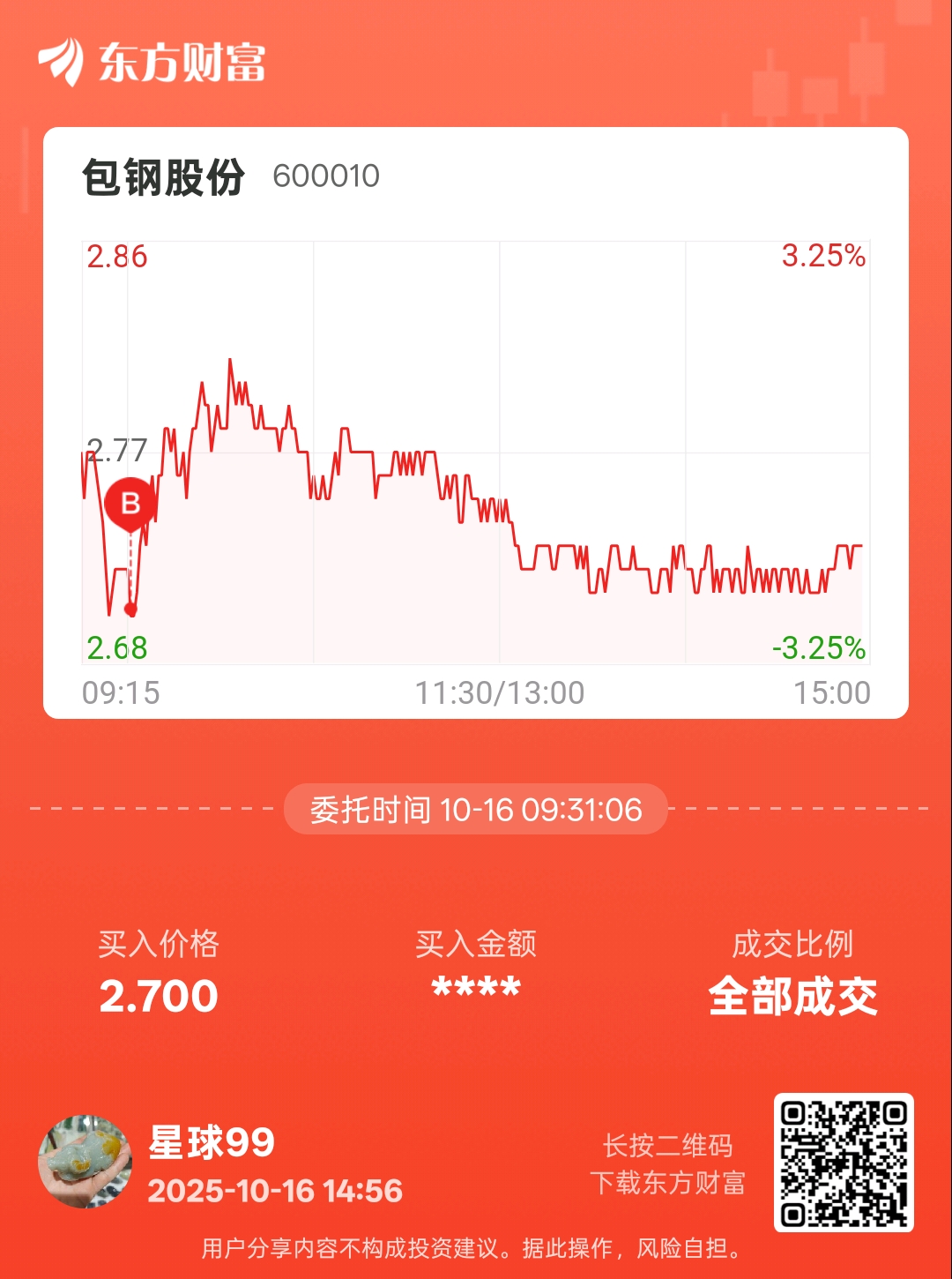 买卖方向:首先恭喜今天卖出的保守派股民成功躲避风险 再次恭喜今天加入的朋友们 包钢个人感觉在空中加油 主力手里的票早出了 他都后悔 他都没想到这么多三户来接盘 结果他想吸盘 吸盘无力 再洗下去相当于卖飞 只能等时际 还有一点这个票 机构一直重仓 这些都是 个人心得 不 建议参考祝你们好运大家 !#炒股日记#