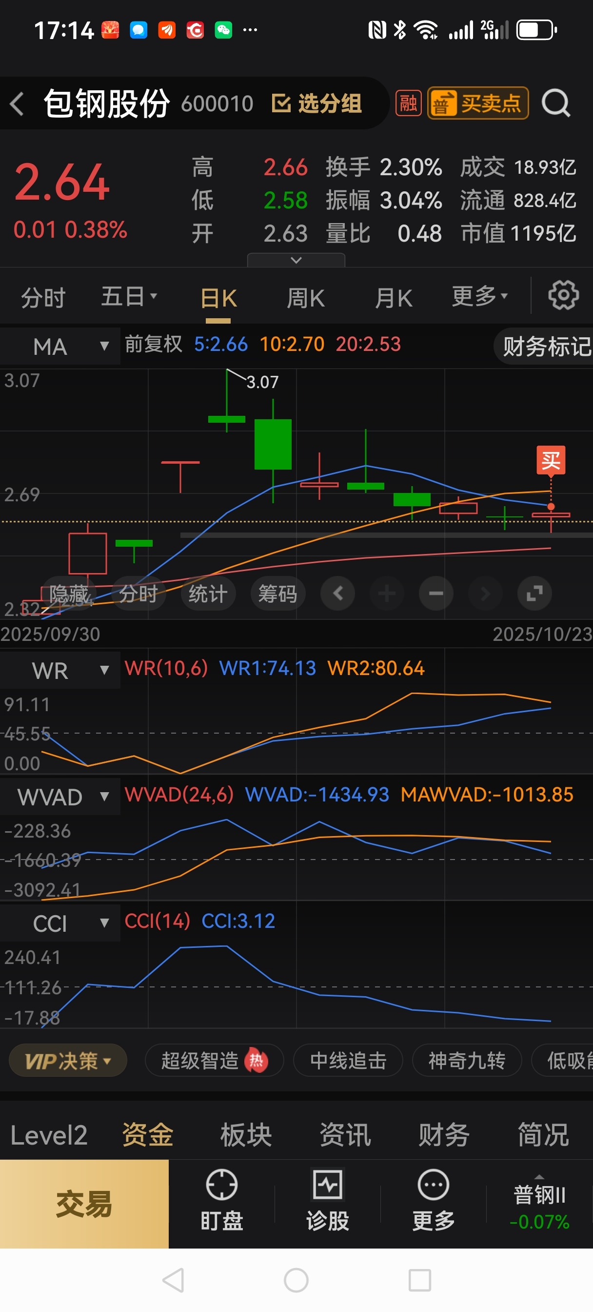 包钢股份,昨天晚上22点38分36 秒,委托挂单2.59买入,10月23号,已成交建仓2.59。