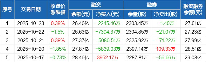融资方面,当日融资买入2.55亿元,融资偿还2.77亿元,融资净偿还2245.46万元,连续4日净偿还累计2.06亿元。融券方面,融券卖出16.29万股,融券偿还17.69万股,融券余量2303.45万股,融券余额6081.11万元。融资融券余额合计27.01亿元。