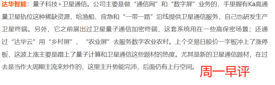 达华智能:量子科技+智能终端+新兴业务拓展。量子科技的龙头股,今天这个票大幅高开后再度封板,现在已经四连板了,而且带动了盘中量子科技板块的回流,目前主升势能良好,继续锁仓。
