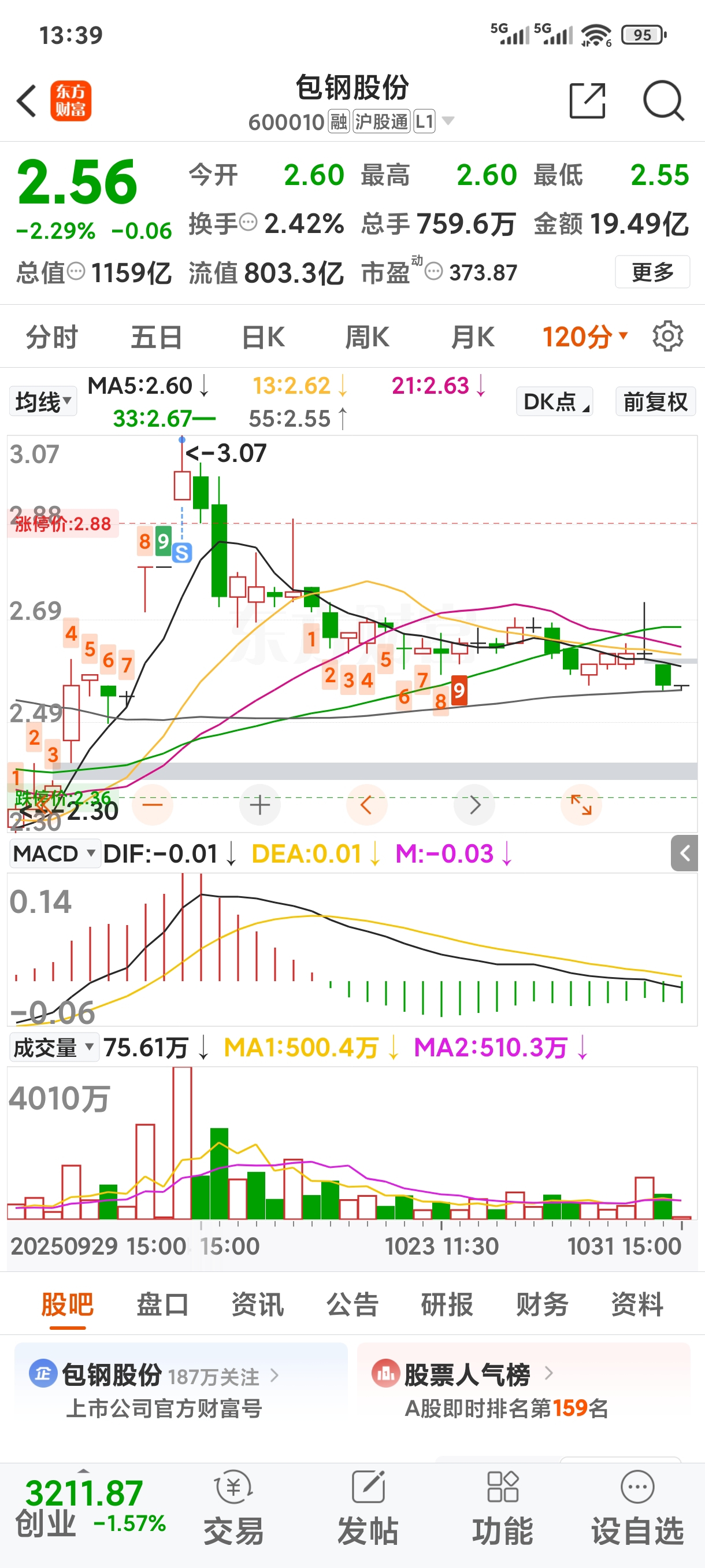 $包钢股份(SH600010)$ 上次3:07走,等准备突破2.6,再进回